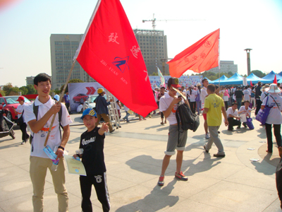 小姑娘自豪地展示公司“致远人”毅行旗帜