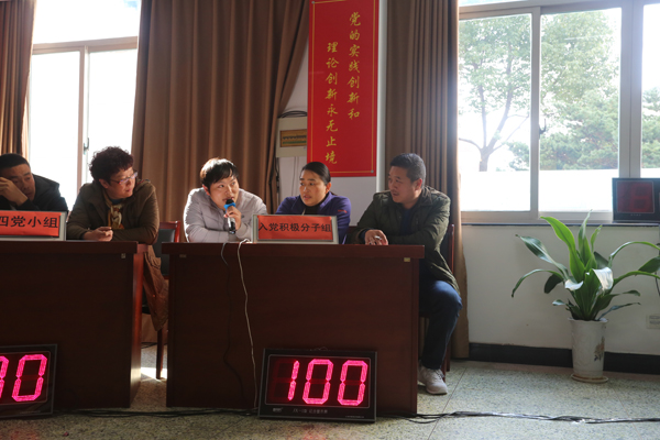 竞赛以致远支部党小组为单位参赛,每小组选3人成立一个参赛队,4个党小组4个参赛队,另加一个入党积极分子组成的参赛队,共5个队参赛。题型有单选题、多选题、抢答题等三种题型,分别由三位评委现场打分。竞赛在“团结、紧张、严肃、活泼”的气氛中进行,你追我赶,比分此高彼涨,每队各领先一时。竞赛过程中,主持人还与现场观众进行了欢快互动,答对了就有个小礼品赠送。经过3轮的激烈竞争,最后第四党小组以230分拔得头筹,第二党小组和入党积极分子组都以210分同时名列第二。后增加赛题,入党积极分子组“一键”抢先并回答正确,稳坐第二位,第二党小组错失先机名列第三。